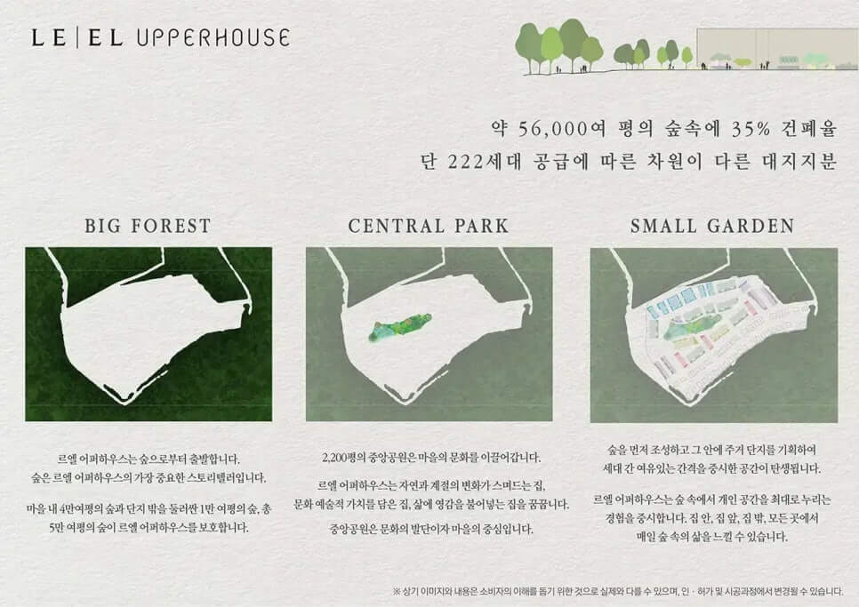 르엘 어퍼하우스는 '자연 우선주의' 설계로 유명합니다. 건물을 짓기 전에 먼저 숲을 만들고, 그 숲을 보존하는 방식으로 단지를 설계했습니다. 단지 안에만도 약 4만 평의 숲이, 외부에는 1만6천여 평의 녹지가 연속성 있게 이어지며, 입주민은 그 속에서 하루하루를 살아가게 됩니다.