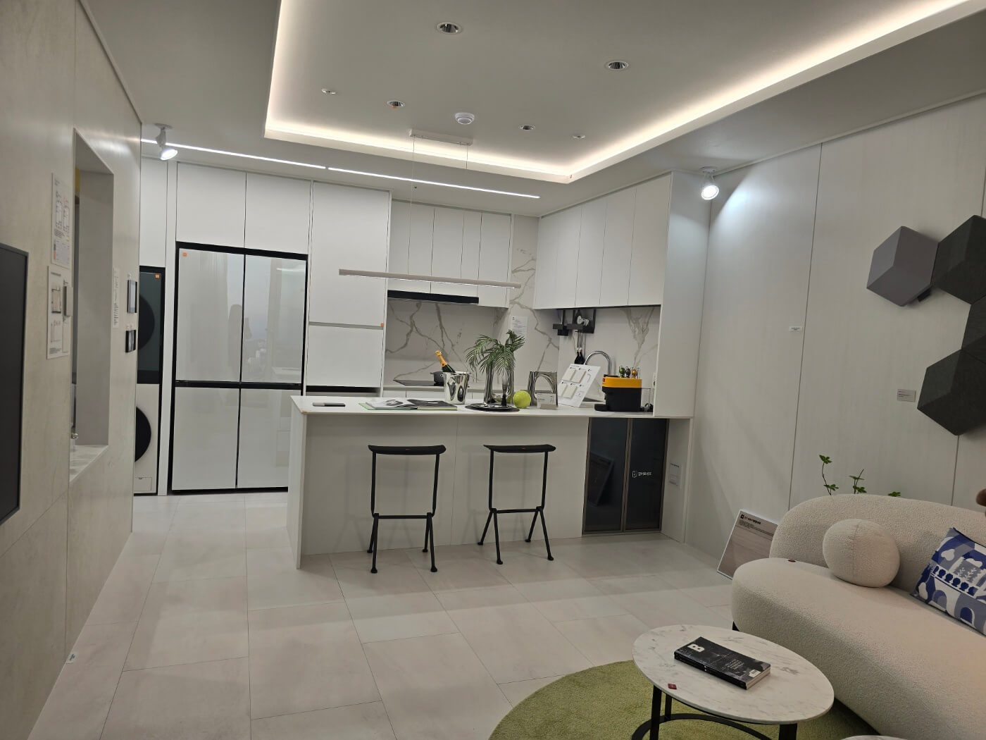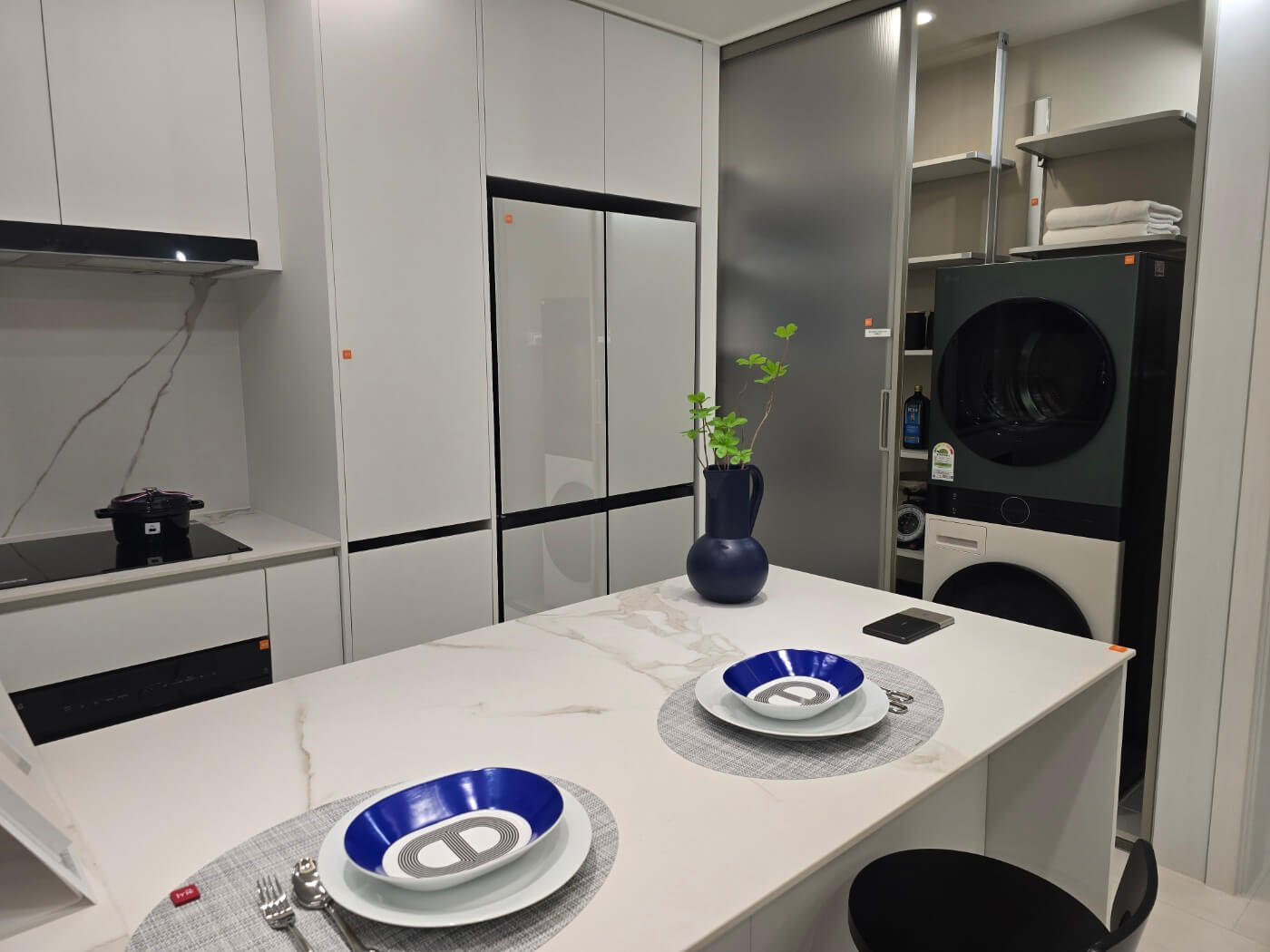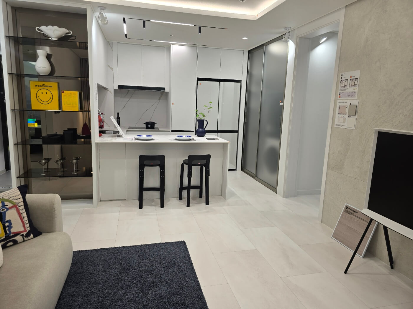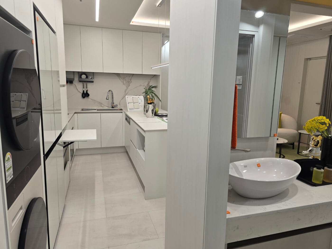 - ㄷ자형 주방 가구 배치로 동선 최소화 및 편의성 강화.