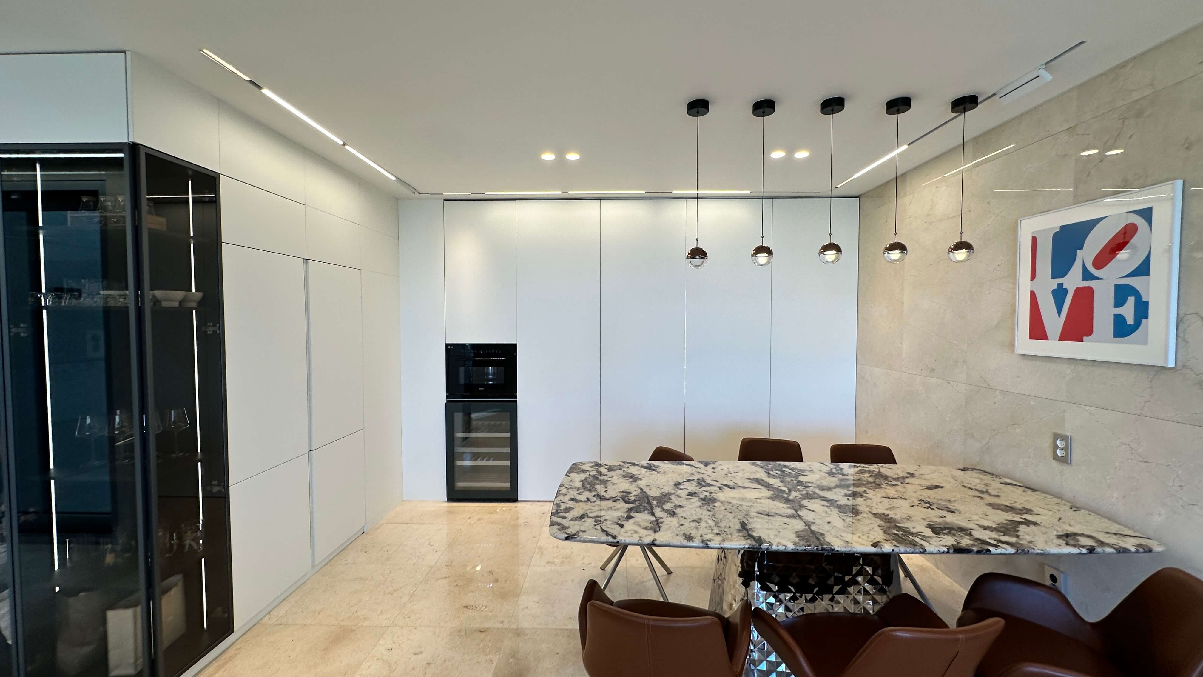 - 와이드한 주방과 다이닝 공간: 상부장 대신 긴 빌트인 수납장을 설치하여 수납의 부담을 줄였으며, 빌트인 냉장고, 인덕션, 오븐, 와인셀러 등 최고급 옵션이 기본 제공됩니다. 주방에서 바베큐존(야외 테라스)으로 바로 연결되어 편리합니다.