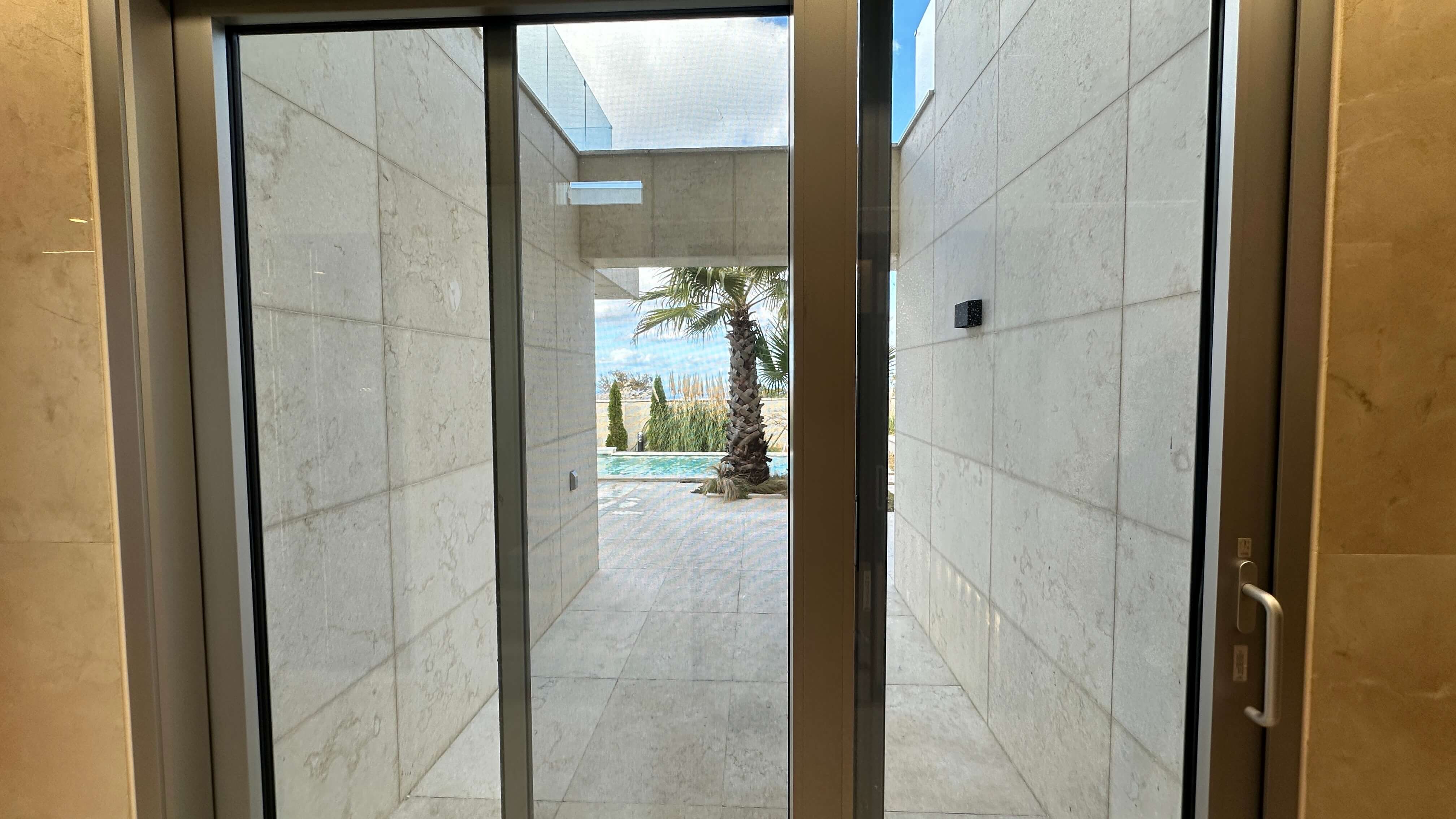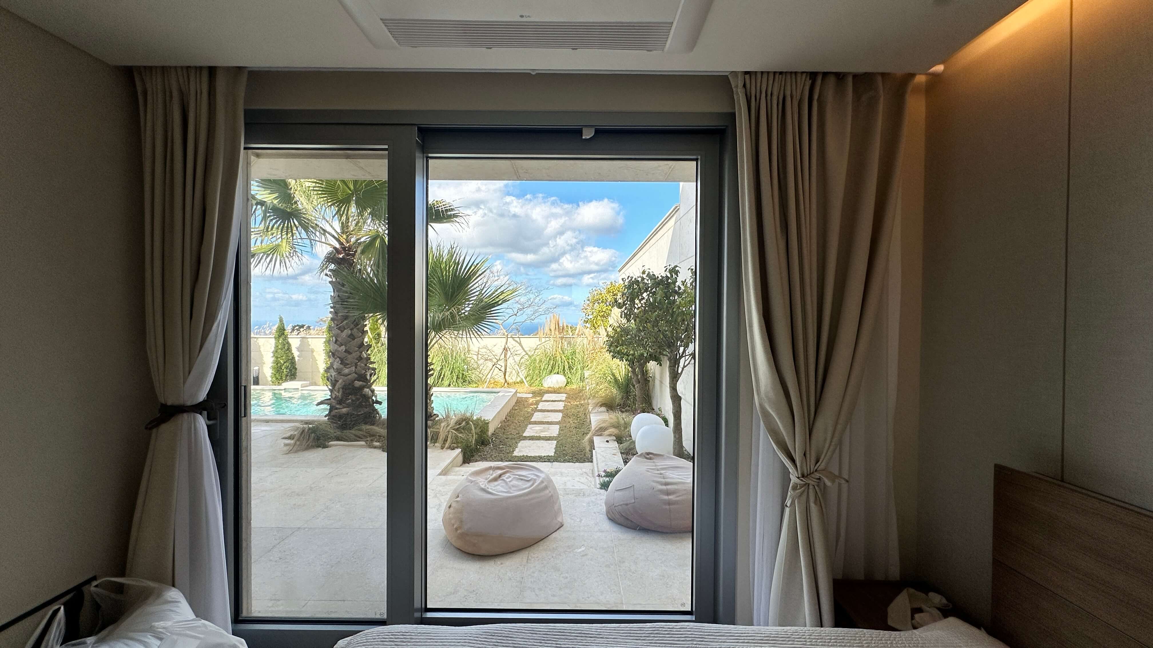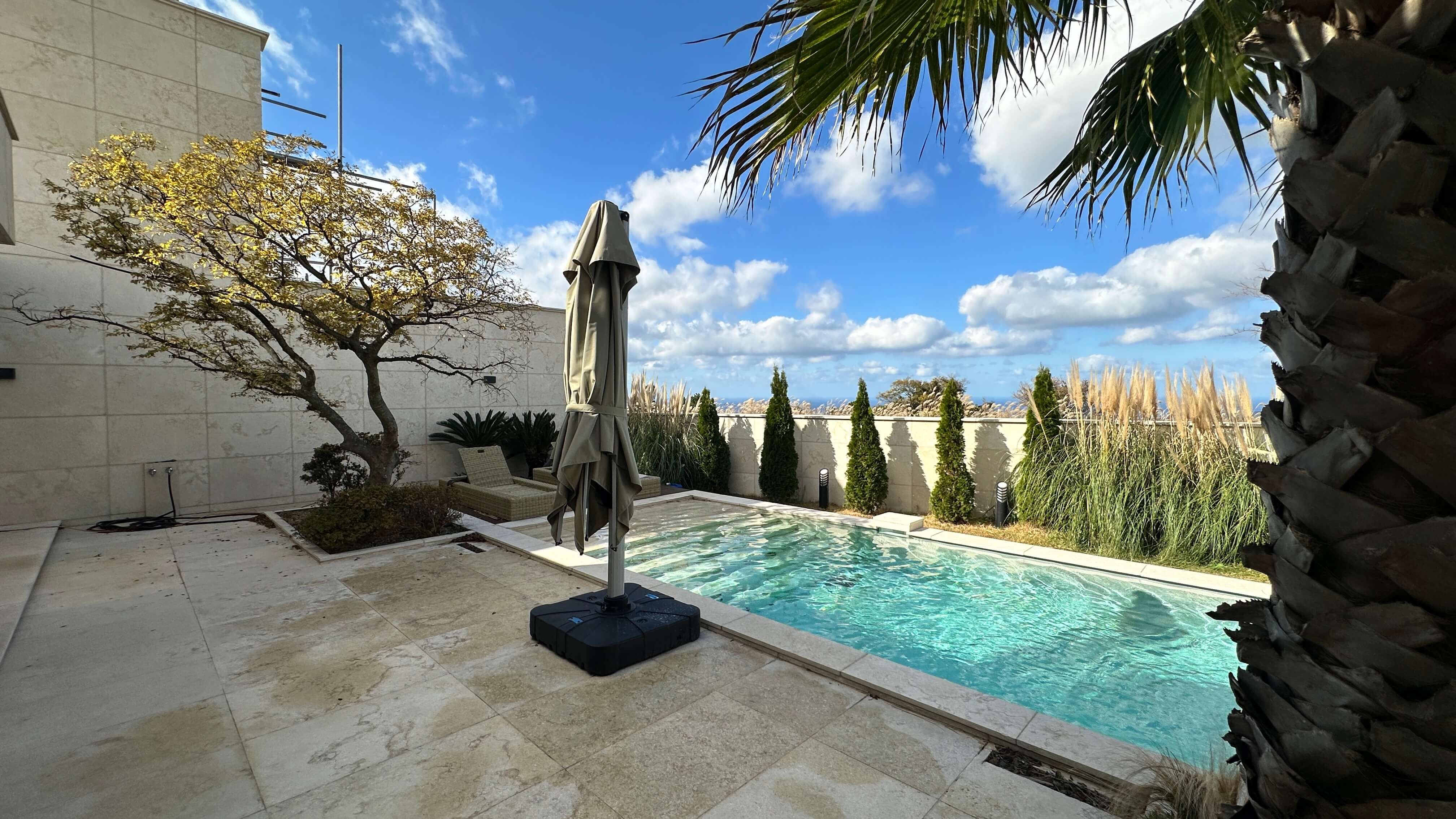 - 풀빌라의 정점, 수영장: 온수풀이 가능한 수영장과 제주스러운 야자수가 식재된 정원은 건물 외관부터 바닥까지 천연 대리석으로 마감되어 휴양지의 느낌을 물씬 풍깁니다. 거실과 주방에서 통창을 통해 수영장 조망을 즐기며 바로 나갈 수 있도록 설계되어 개방감이 탁월합니다.