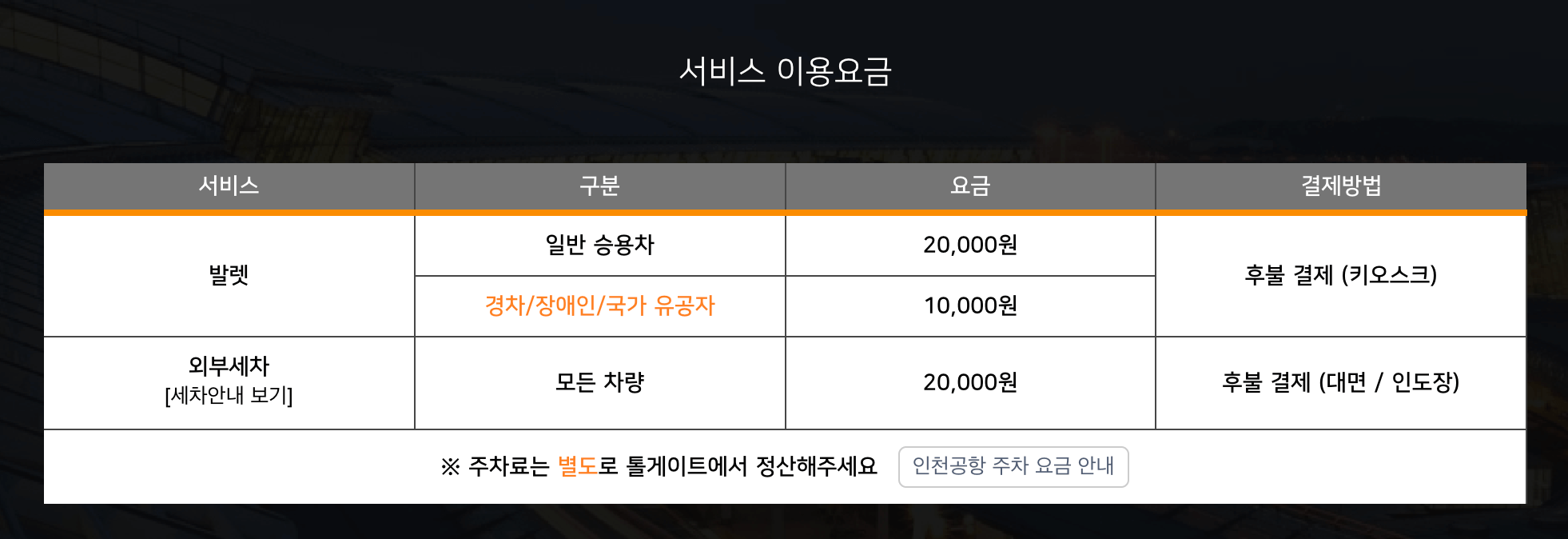 공식 주차대행 요원은 주황색 유니폼을 착용하고 있습니다. 사설 주차대행 이용 시 피해가 발생할 수 있으니 주의하세요.