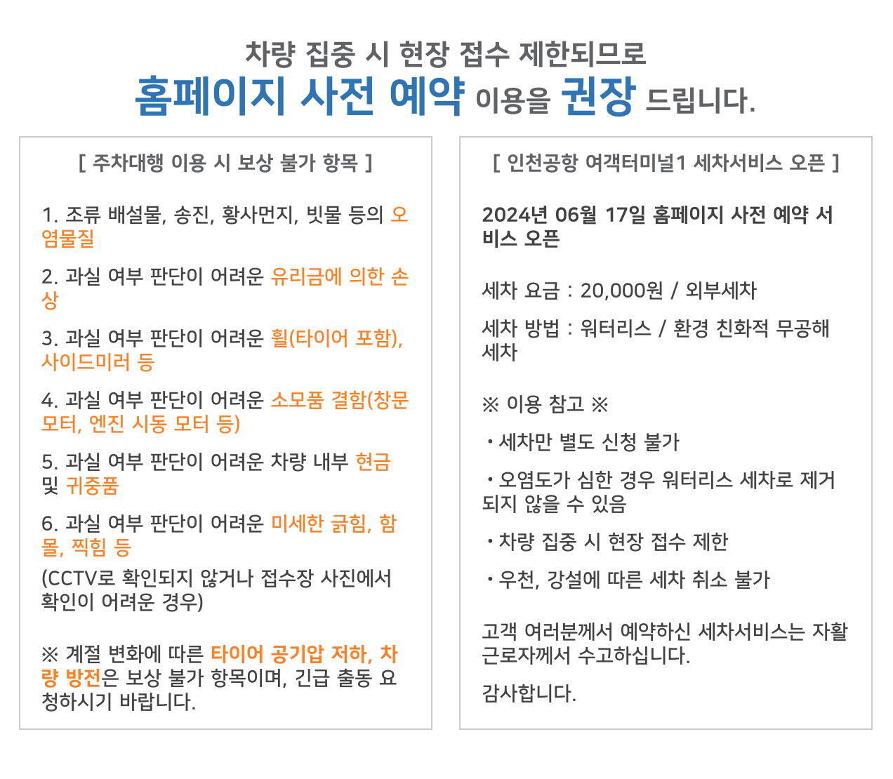 인천공항은 성수기에 차량이 집중적으로 몰립니다. 이로 인해 현장 접수가 제한될 수 있으니 사전예약을 적극 권장합니다. 사전예약을 하면 접수 시간을 대폭 줄이고 빠르게 차량을 맡길 수 있습니다.