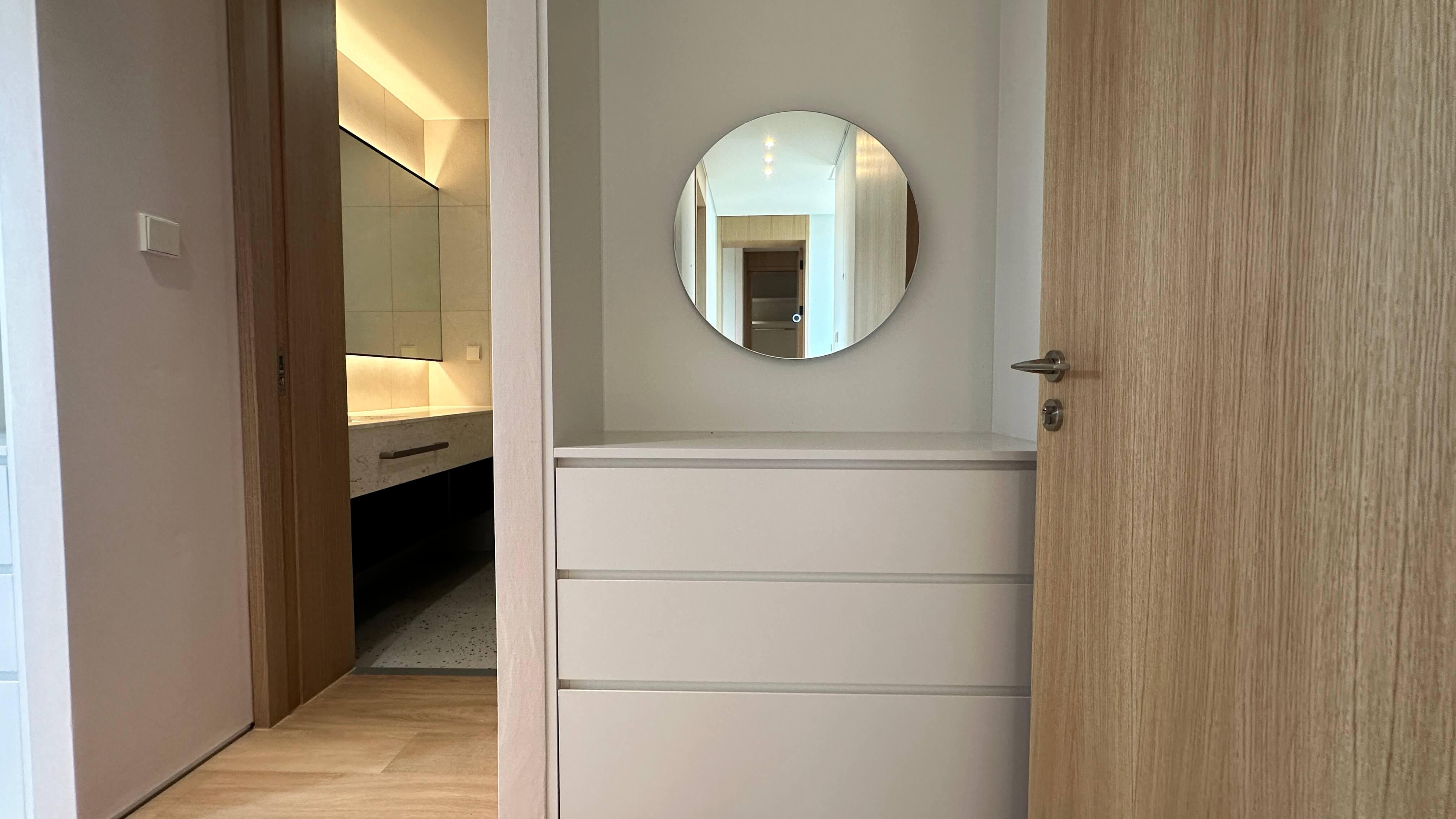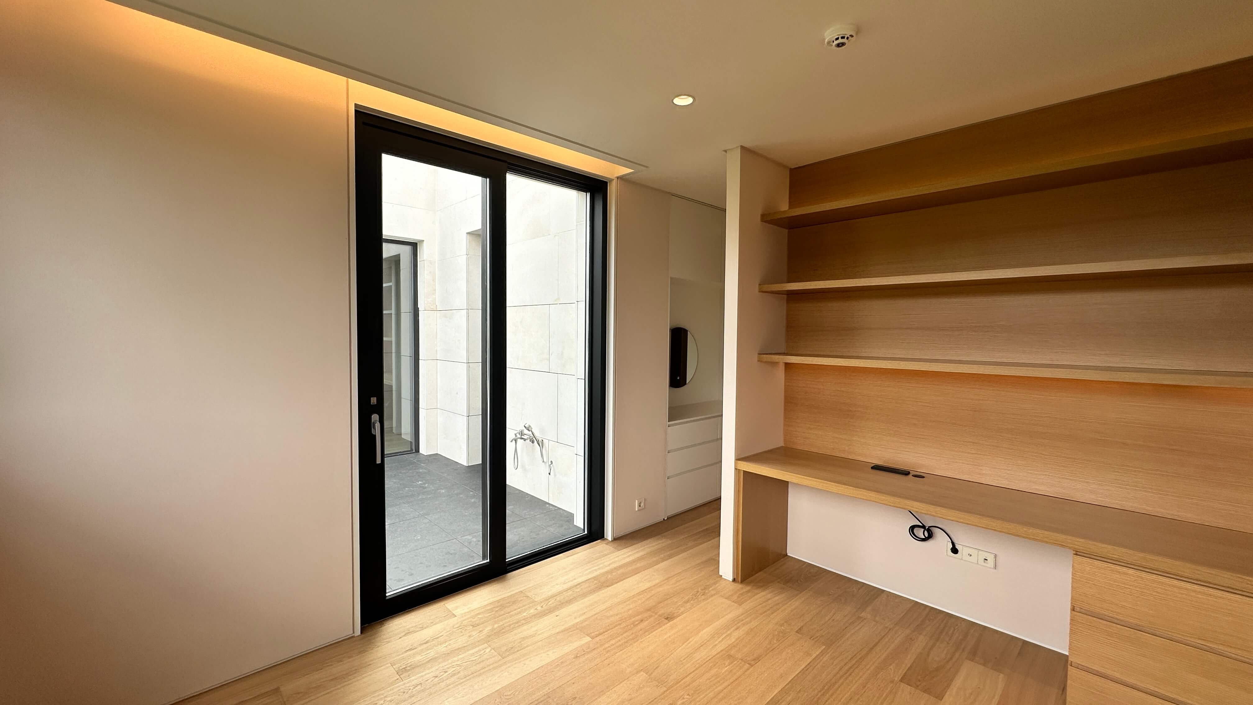 작은 방 2개는 침실, 붙박이장, 파우더룸, 책상, 전용 욕실을 갖추고 있어 효율적인 공간 활용이 가능합니다. 침실은 시스템 에어컨, 개방감 있는 베카 창호, 광폭 원목 마루로 시공되어 안락한 분위기를 조성합니다. 파우더룸에는 간접조명이 설치되어 있으며, 이태리 타일로 마감된 욕실은 매립식 수전, 일체형 비데, 조적 샤워부스 등으로 고급스러움을 더했습니다.