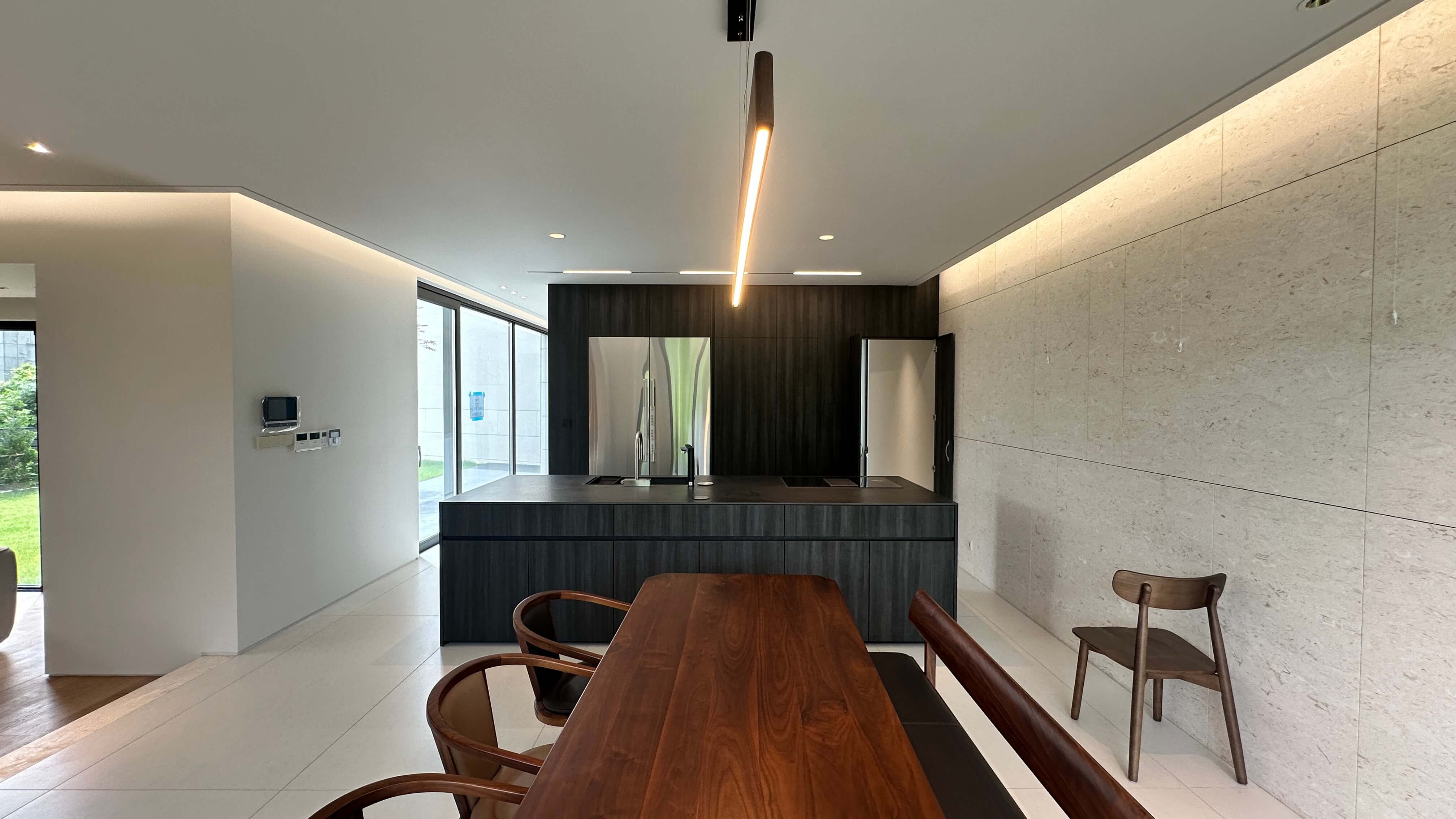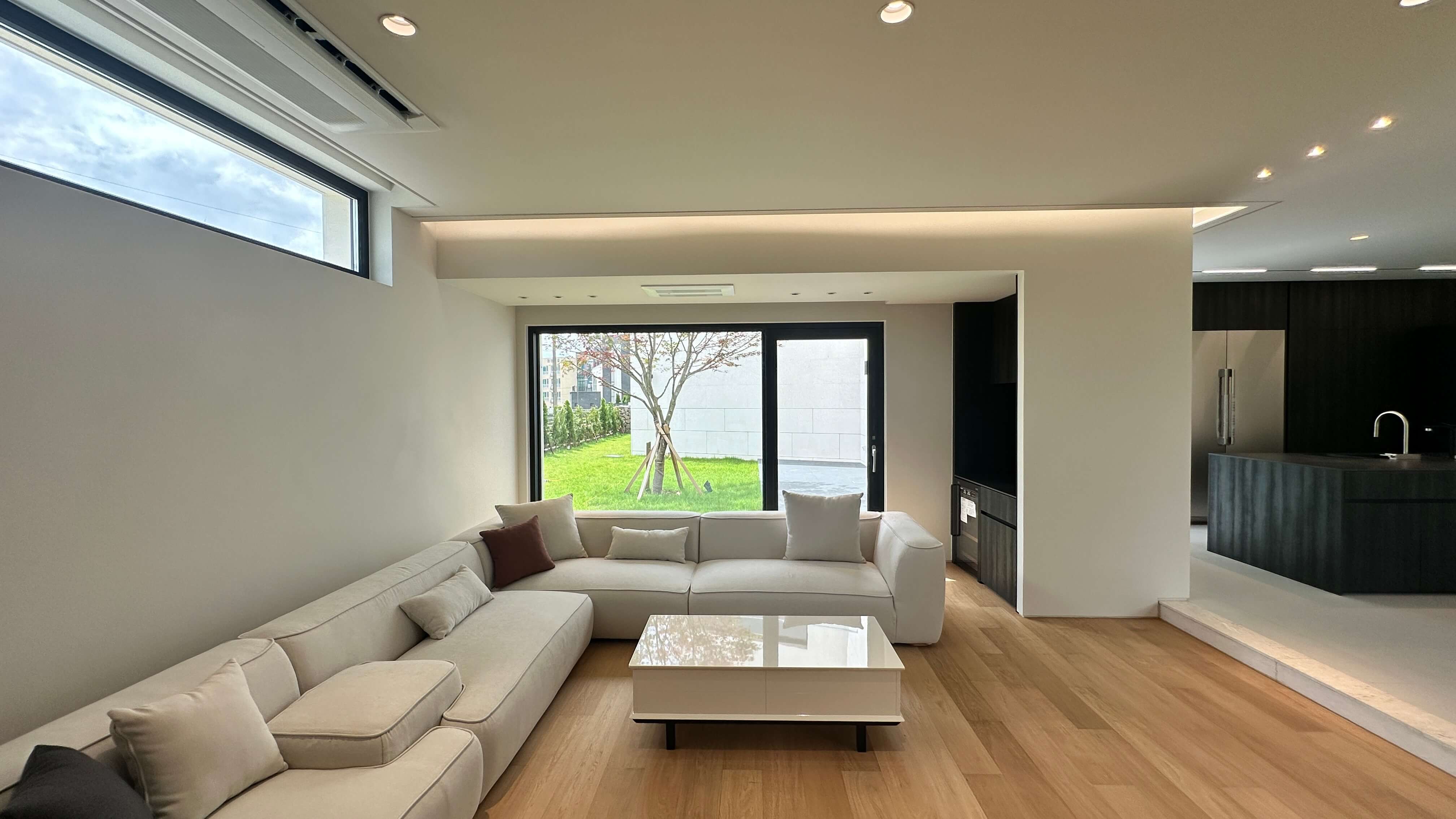 1층은 거실, 주방, 팬트리, 보조주방, 정원으로 구성되어 있습니다. 현관을 들어서면 주방과 거실로 가는 길목에 통창이 시공되어 탁 트인 개방감을 느낄 수 있습니다. 주방은 블랙 계통의 이태리 가구로 꾸며져 있으며, 11자 구조의 동선 설계로 넉넉한 공간감을 자랑합니다. 또한, 풀옵션으로 제공되는 주방 가전은 모두 빌트인으로 설치되어 있어 군더더기 없이 깔끔한 인테리어를 완성합니다.